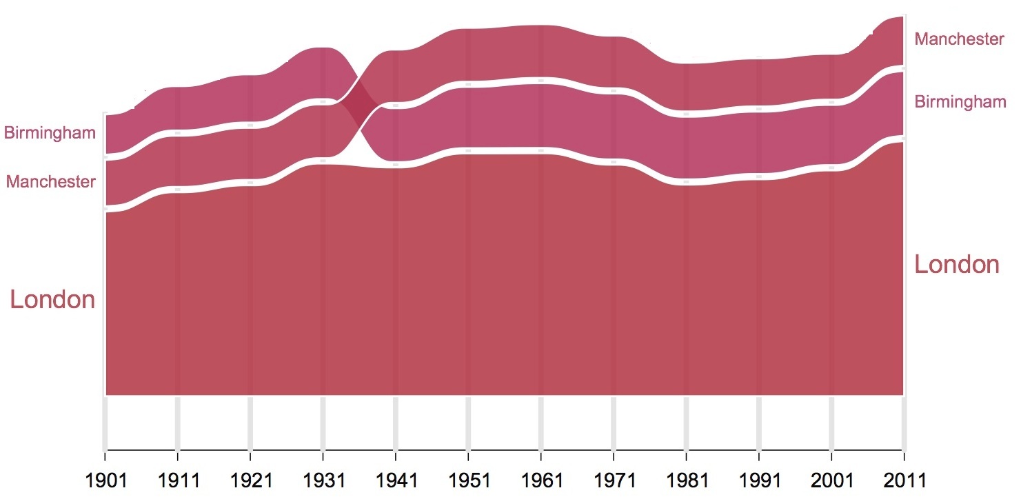However what makes this tool so interesting is that the rank of these cities may change. If the largest city at the first time period becomes the next largest at the next time period, its position on the graph will change, and in this way we will see the cities changing in rank as well as size through time. In our UK data set of cities as primary urban areas, if we consider the largest city in the urban system which is London, this remains the top rank over the last 100 years but Manchester is the second until 1941 when Birmingham takes over. We show this section of the graph which is the bottom three streams of the graph shown above as follows.